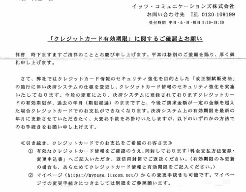 経緯 更新 資料を書いたボールペンがフリクションだった できた…… 経緯 インターネット接続などに、イッツコムを利用しています。で、突然こんな資料が届いたのです。 イッツコムからカード払い情報更新を求める通知イッツコムの支払いには楽天カードを利用…
