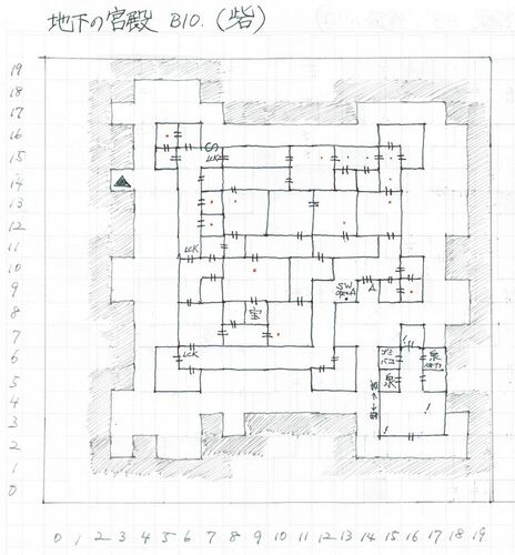 Wizardry外伝~五つの試練~、シナリオ「旅人の財産」のマップ「地下の宮殿 砦」です。地下10階の最下層となります。 地下の宮殿 砦 マップ 砦の外周には隠し扉が1つあります(左上)。ただ、そこから入れるのは一部のみ。 砦の右下に宿屋と称して回復系の泉…