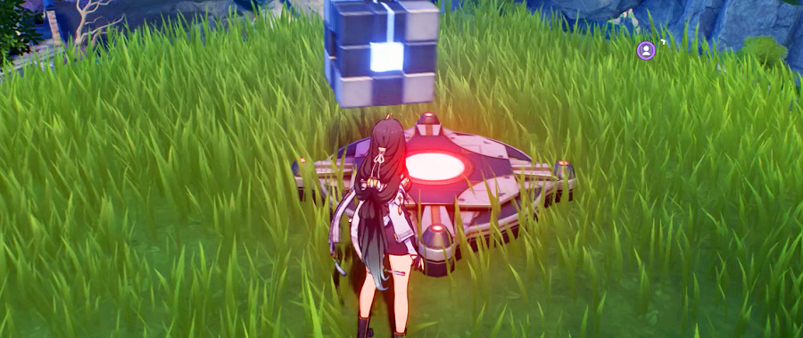 感圧版のようなものに物を載せると、近くの秘蔵箱などのロックが解除されます。負荷がなくなるとまたロックされるので、付近にあるキューブ状のオブジェクトをスキルで移動させ、感圧版に載せるとクリアできます。